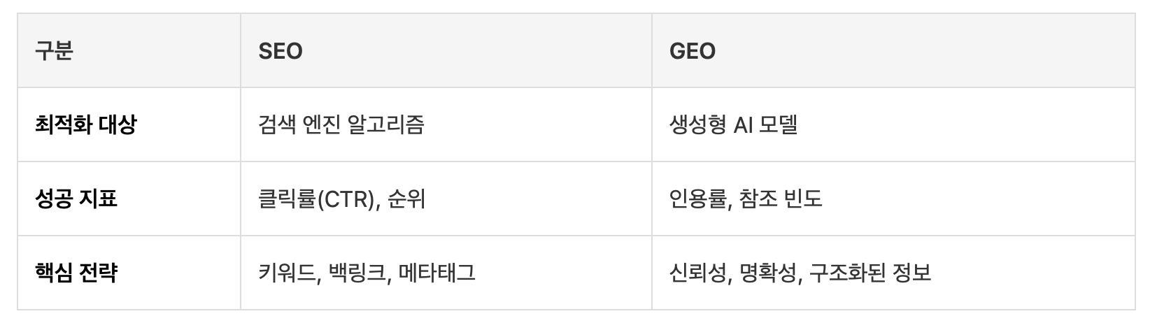 이러한 패러다임 변화 속에서 어떤 콘텐츠가 생성형 엔진에 의해 인용되고 추천되는지가 중요해졌습니다. 이제 기존의 검색엔진최적화(SEO)만으로는 이러한 변화에 효과적으로 대응하기 어려워졌고, 이 때문에 생성형 엔진 최적화, GEO(Generative Engine Optimization)라는 새로운 개념이 등장하게 되었습니다.