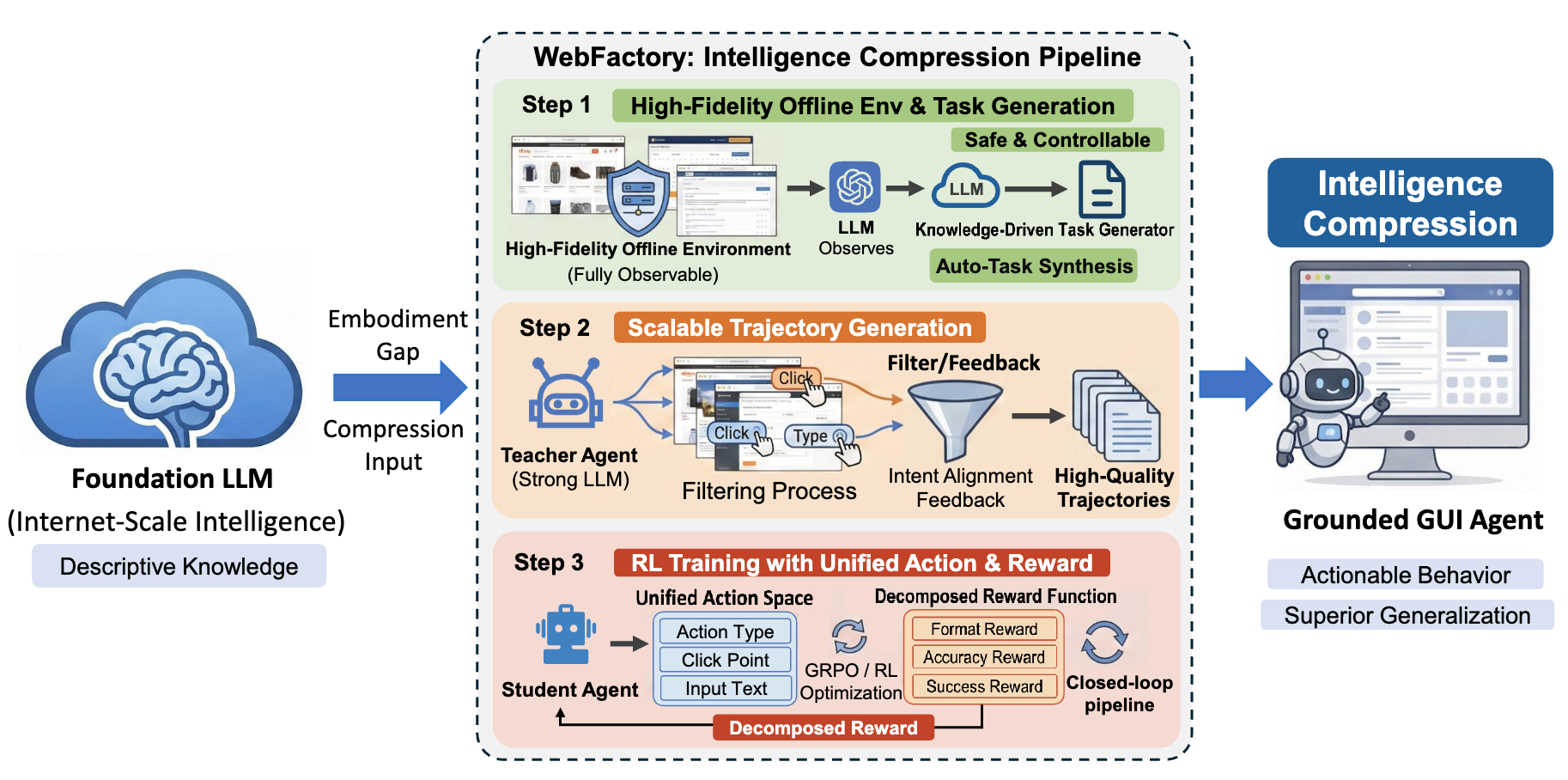 WebFactory에서는 이 문제를 semantic-to-action gap이라 부릅니다. LLM은 GUI 인터랙션에 대해 알고 있지만, 복잡하고 동적인 GUI 환경에서 이를 수행하는 능력, 즉 grounding이 빠져 있다는 것입니다.